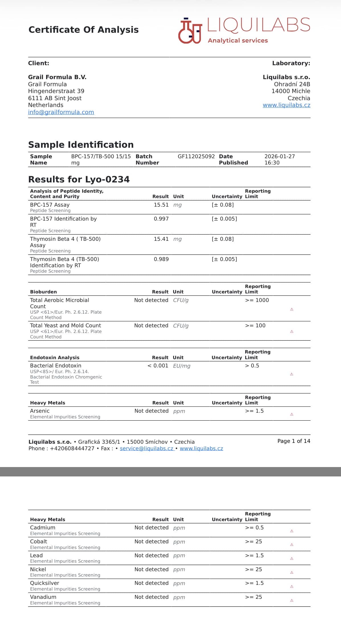 Each batch of BPC-157 / TB-500 Blend supplied by Grail Formula undergoes independent third-party laboratory verification to confirm compound identity, assay content, purity and microbiological safety.