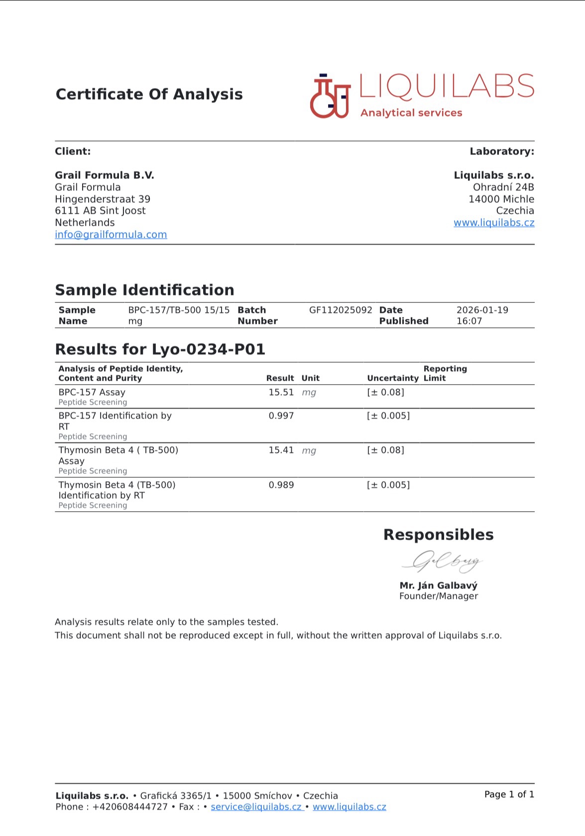 Every Grail Formula research peptide blend undergoes independent third-party laboratory testing for identity, assay accuracy, purity and microbial safety. Each batch is verified for low endotoxin levels, analytical consistency and reproducibility to support reliable scientific research outcomes.