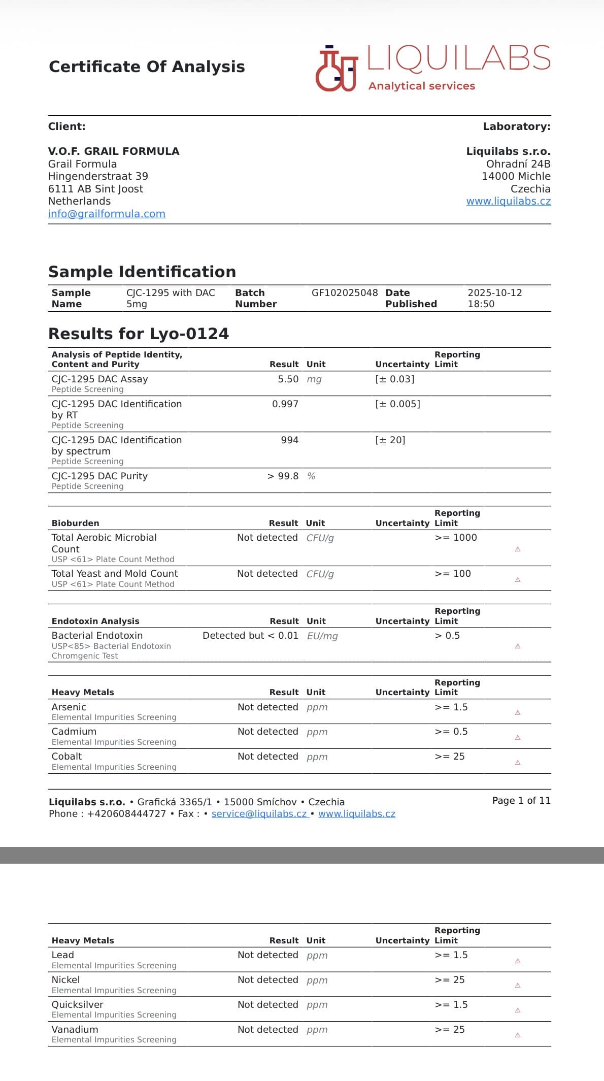 Each batch of CJC-1295 with DAC supplied by Grail Formula undergoes independent third-party laboratory verification to confirm compound identity, assay content, purity and microbiological safety.