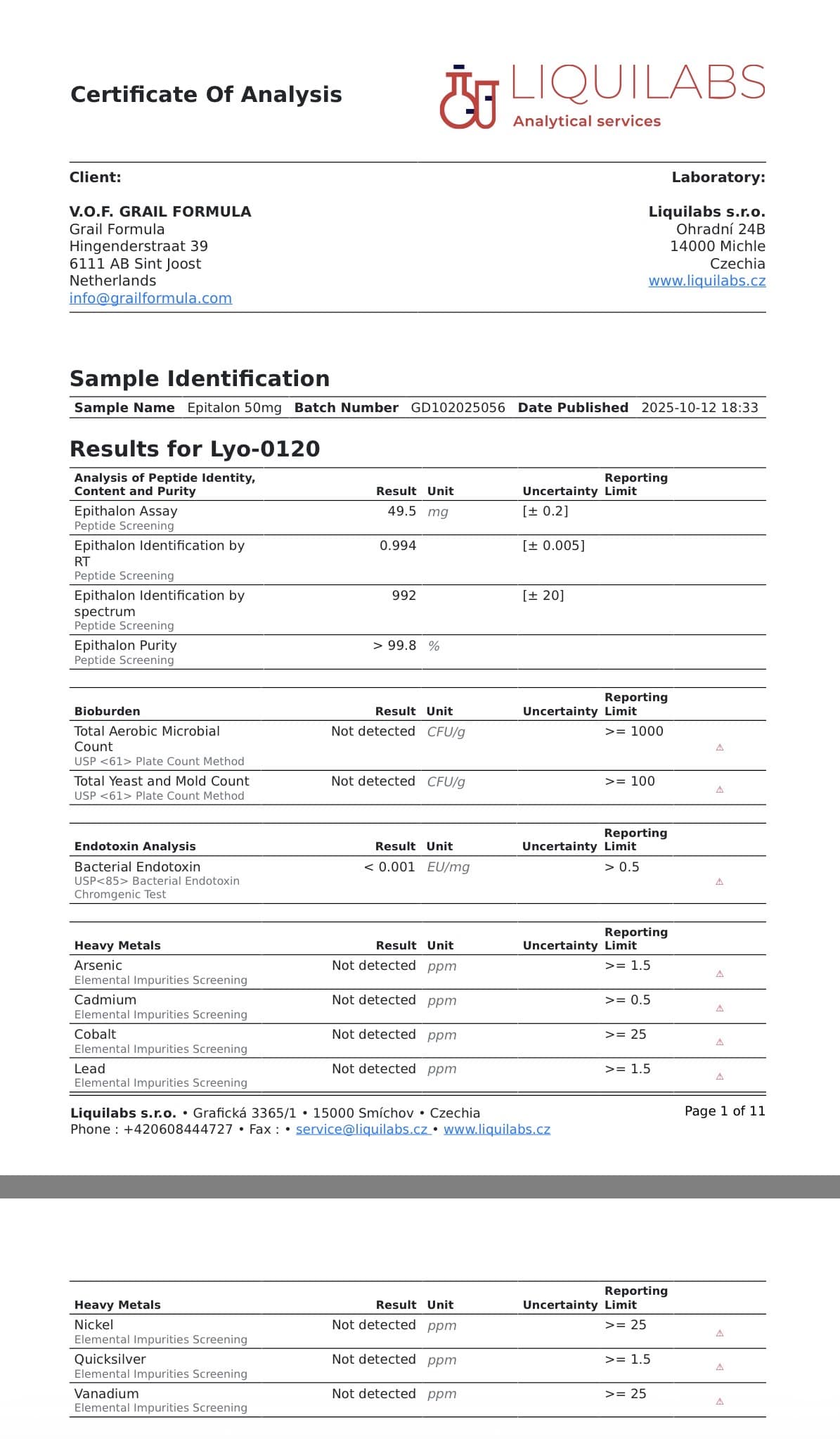 Epitalon 50 mg – Grail Formula Quality — researched and verified with Liquilabs s.r.o. Czechia. Analytical validation confirms above 99.8 percent purity assay content of 49.5 mg RT identification 0.994 spectrum 992 endotoxin below 0.001 EU per mg and no detectable heavy metals or microbial contamination. Supplied as a 50 mg lyophilized peptide with full COA traceability. For research use only — not for human or veterinary use.