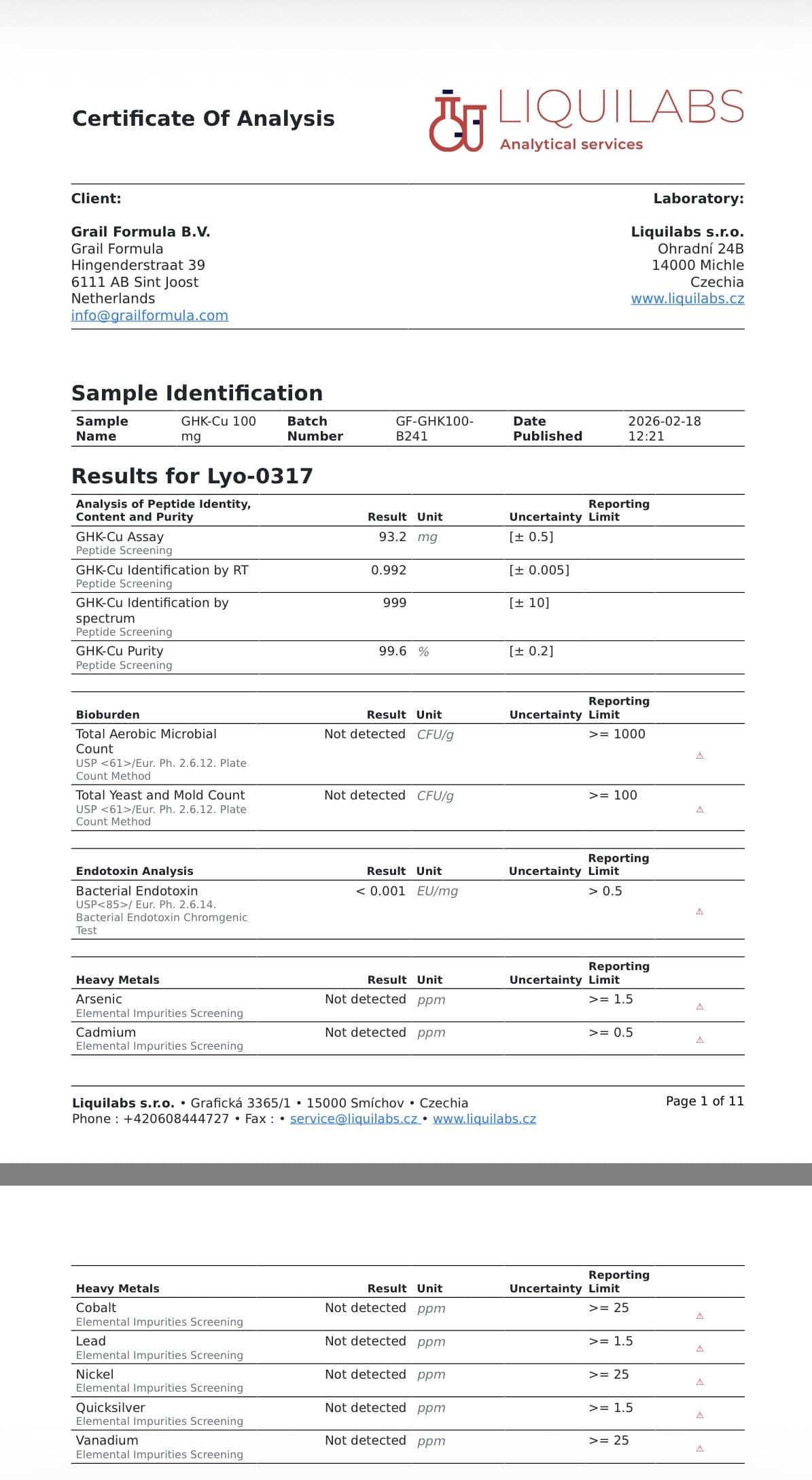 Each batch of GHK-Cu supplied by Grail Formula undergoes independent third-party laboratory verification to confirm compound identity, assay content, purity and microbiological safety.