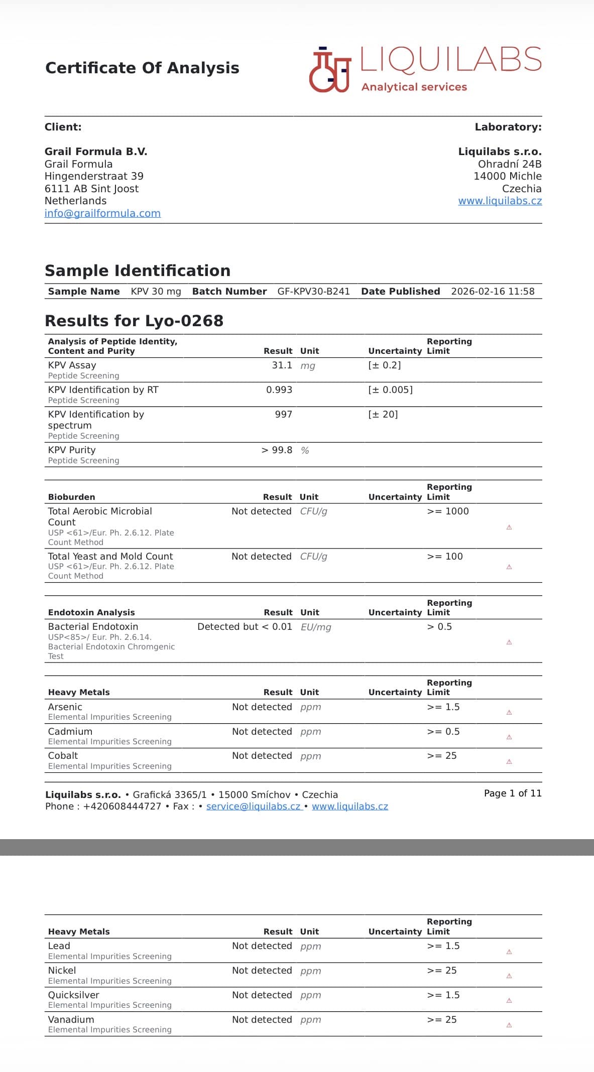 Analytical testing for this batch was performed by Liquilabs s.r.o. (Czechia) using validated chromatographic and spectrometric techniques.