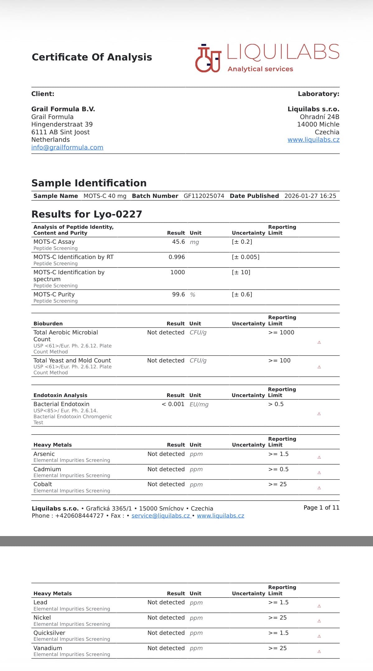 Analytical testing for this batch was performed by Liquilabs s.r.o. (Czechia) using validated chromatographic and spectrometric techniques.