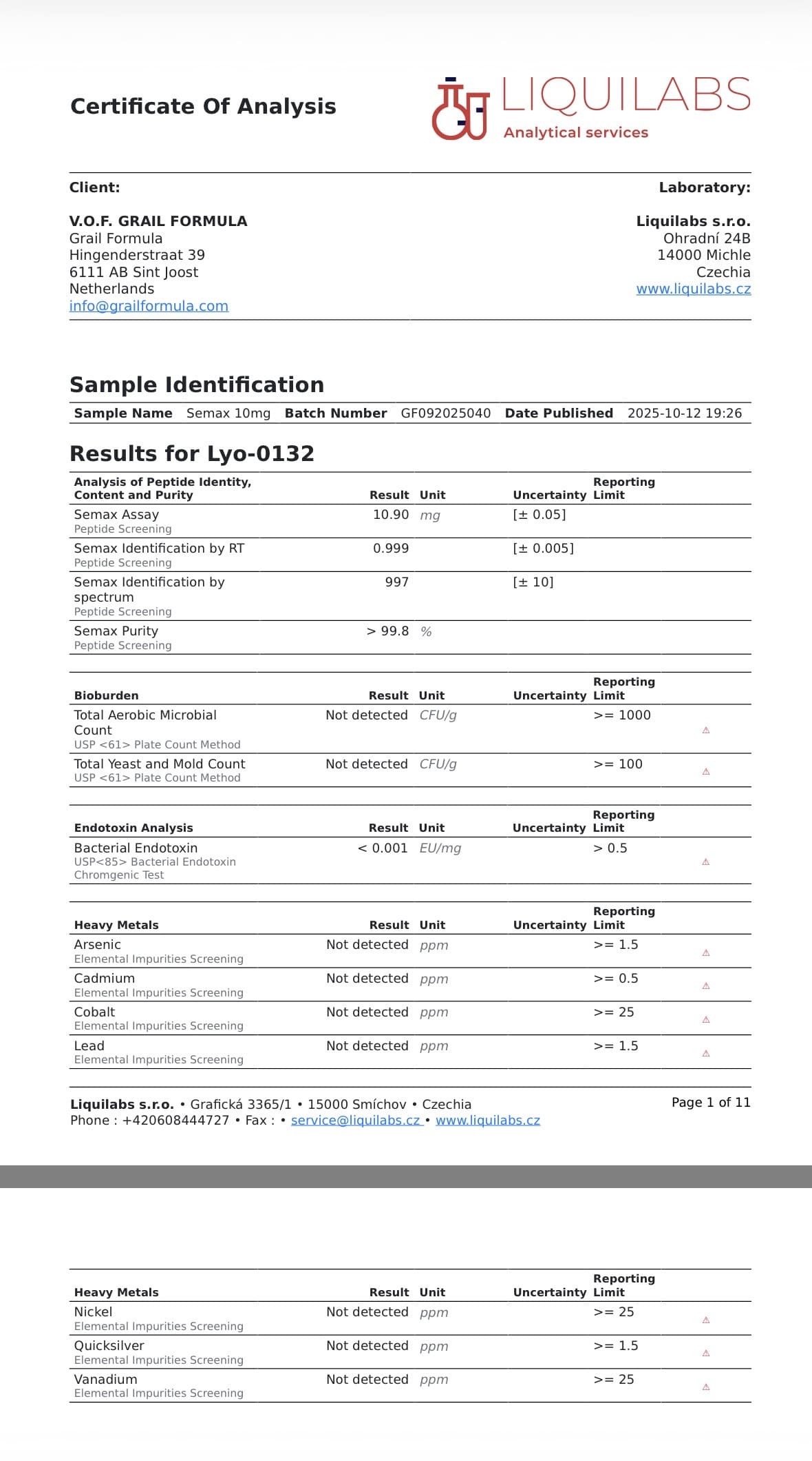 Each batch of Semax supplied by Grail Formula undergoes independent third-party laboratory verification to confirm compound identity, assay content, purity and microbiological safety. Analytical testing for this batch was performed by Liquilabs s.r.o. (Czechia) using validated chromatographic and spectrometric techniques. Batch: GF092025040 Key analytical results include:- Assay Content: 10.90 mg