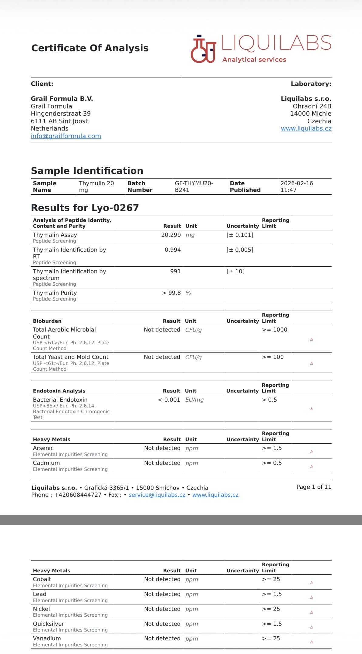 Each batch of Thymulin supplied by Grail Formula undergoes independent third-party laboratory verification to confirm compound identity, assay content, purity and microbiological safety. Analytical testing for this batch was performed by Liquilabs s.r.o. (Czechia) using validated chromatographic and spectrometric techniques. Batch: GF-THYMU20-B241 Key analytical results include:- Assay Content: 20.299 mg